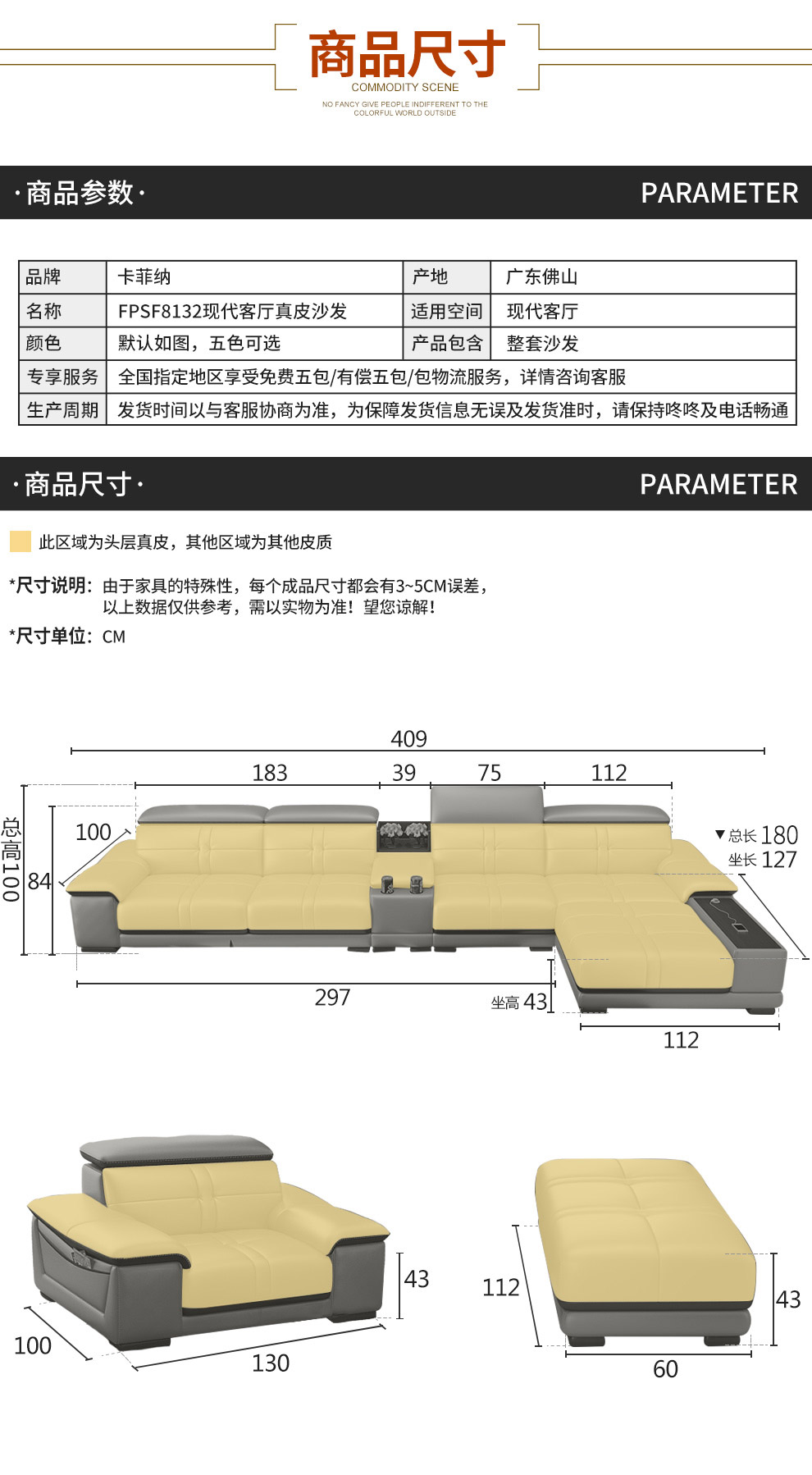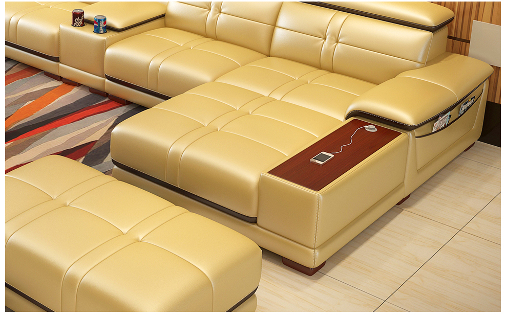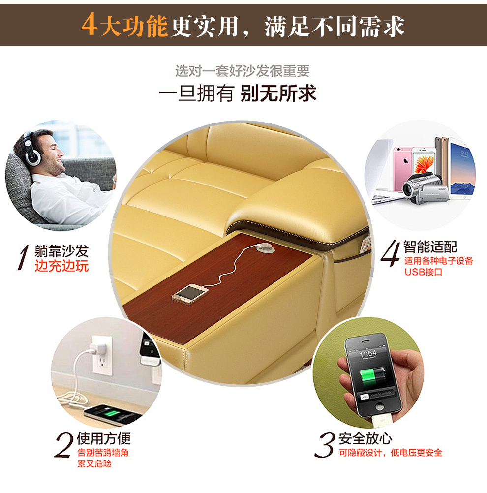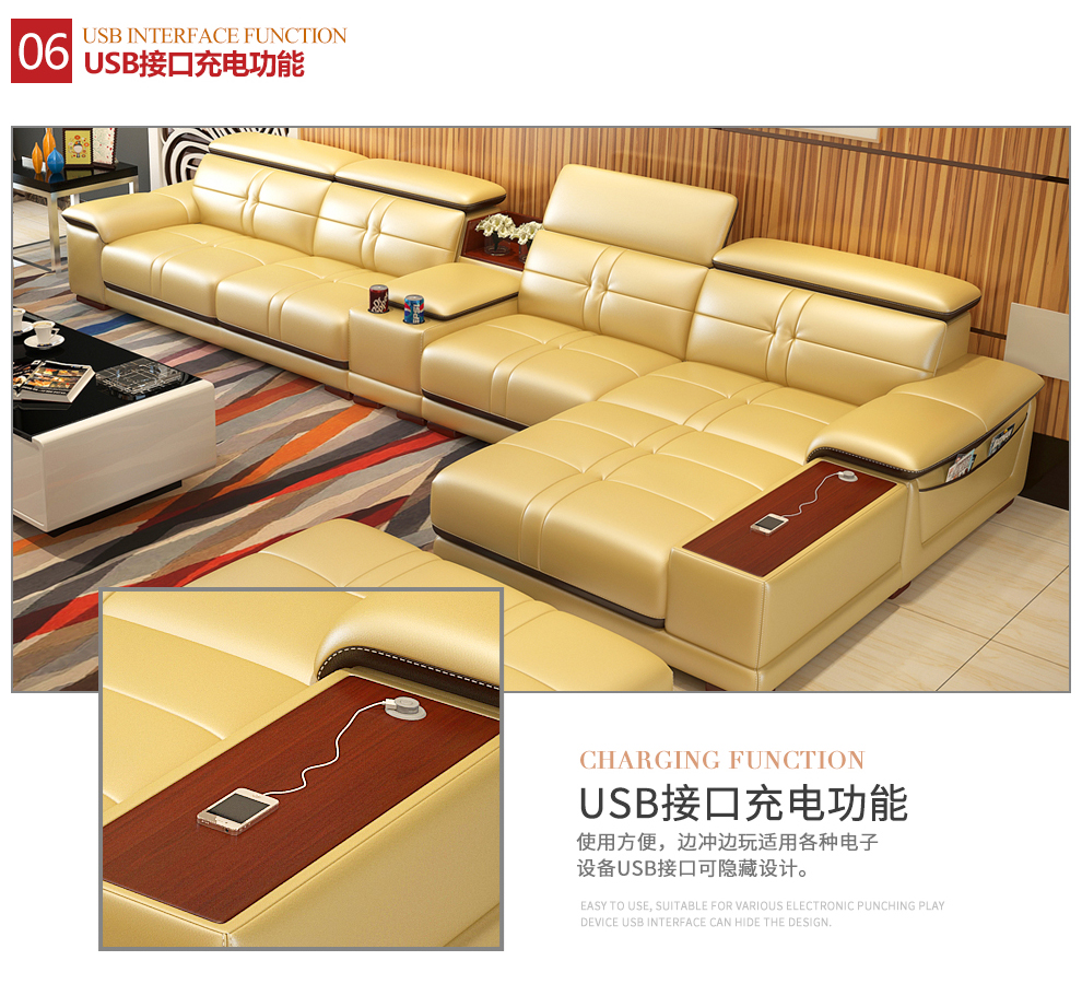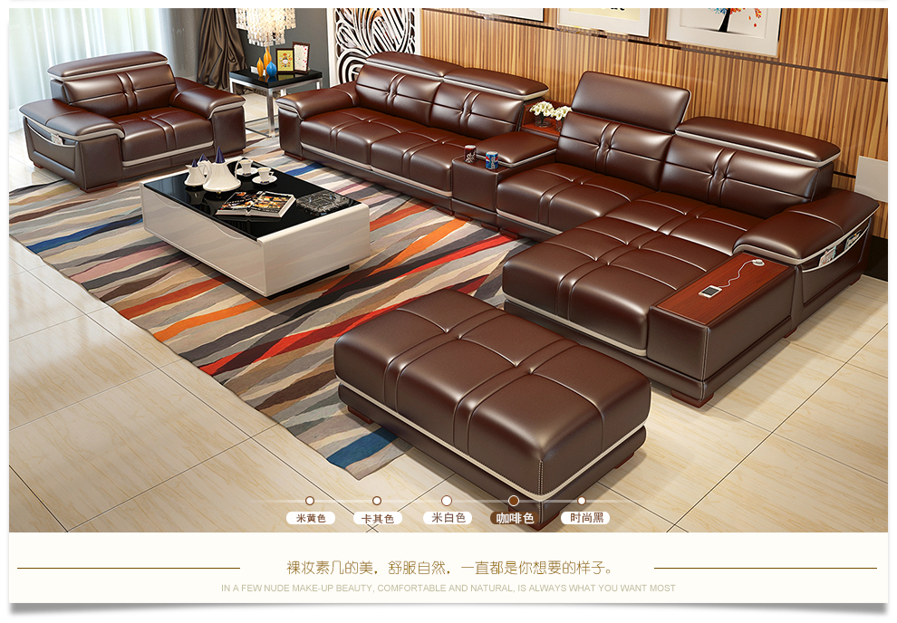 - 商品名称:卡菲纳 沙发真皮沙发组合USB充电功能客厅家具 双人位+贵妃位-赠2个皮凳