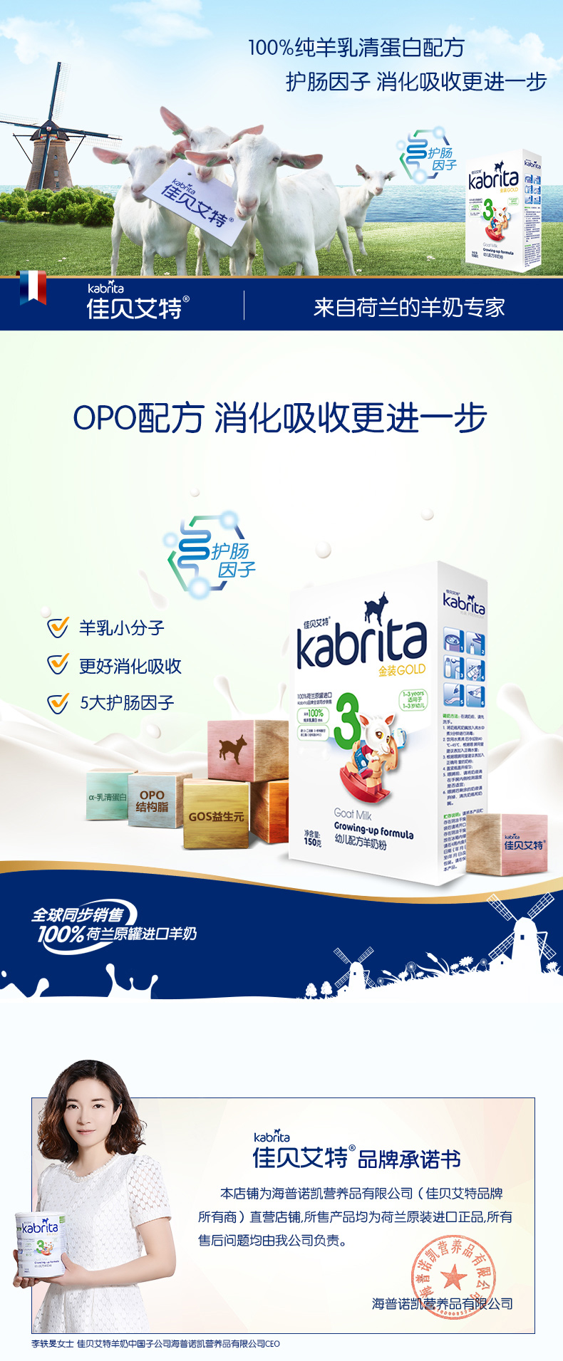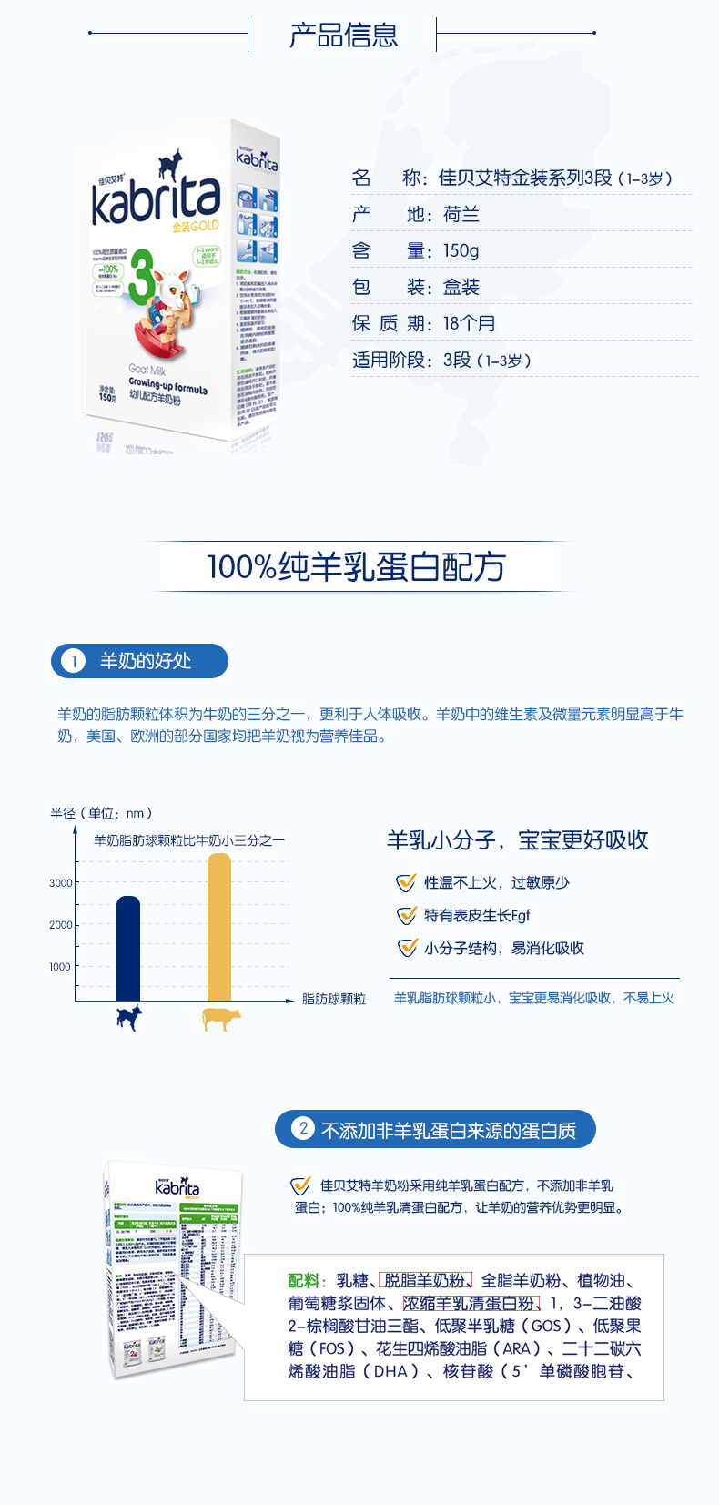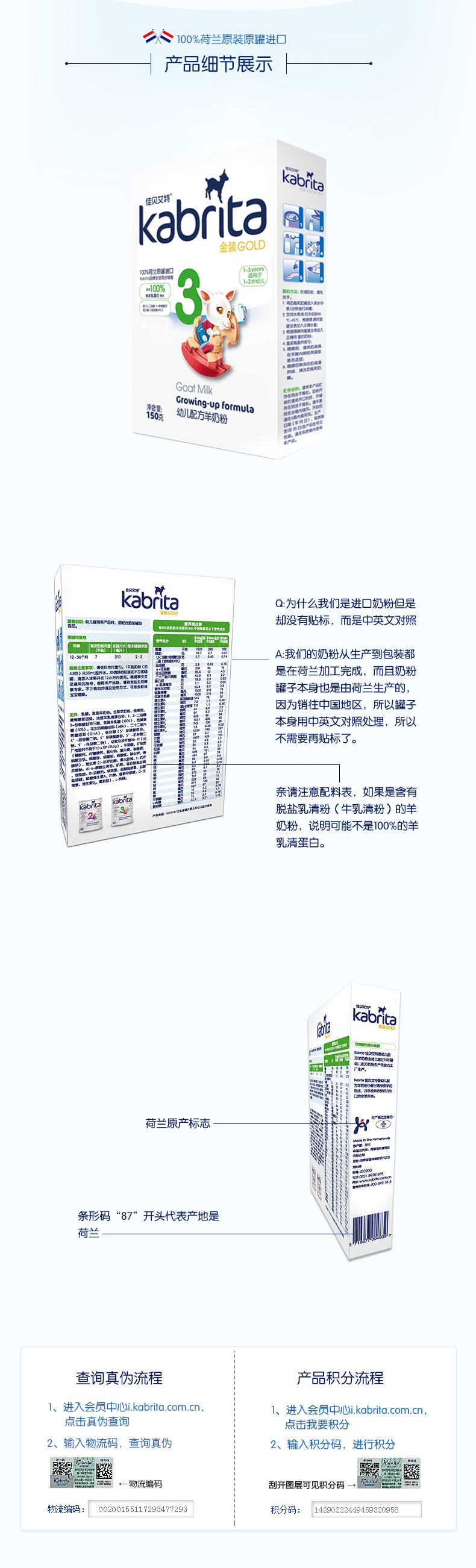 荷兰进口佳贝艾特(kabrita)羊奶粉 金装150g 3段