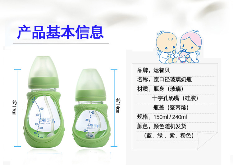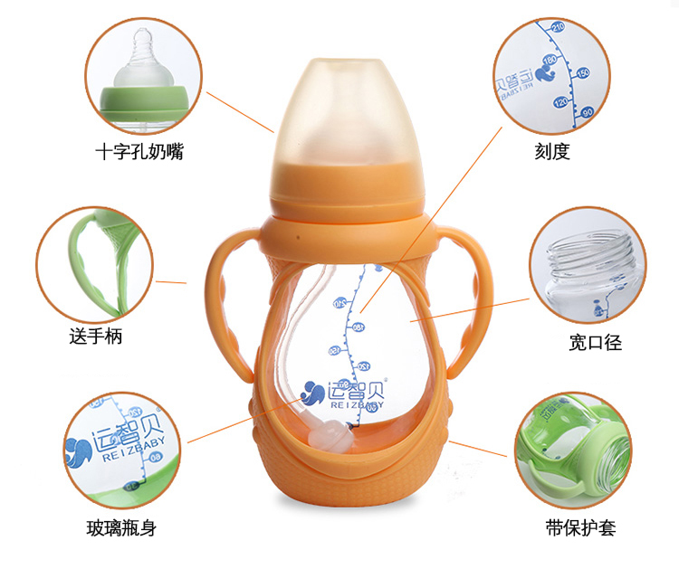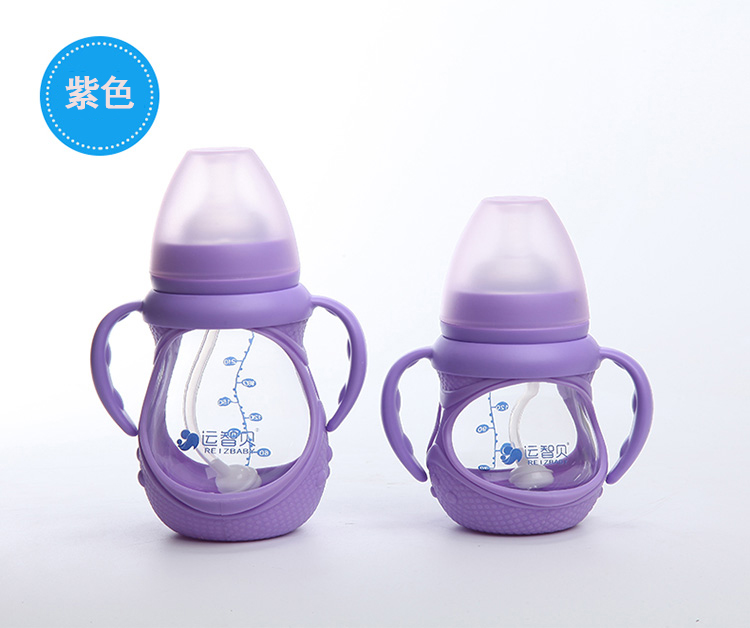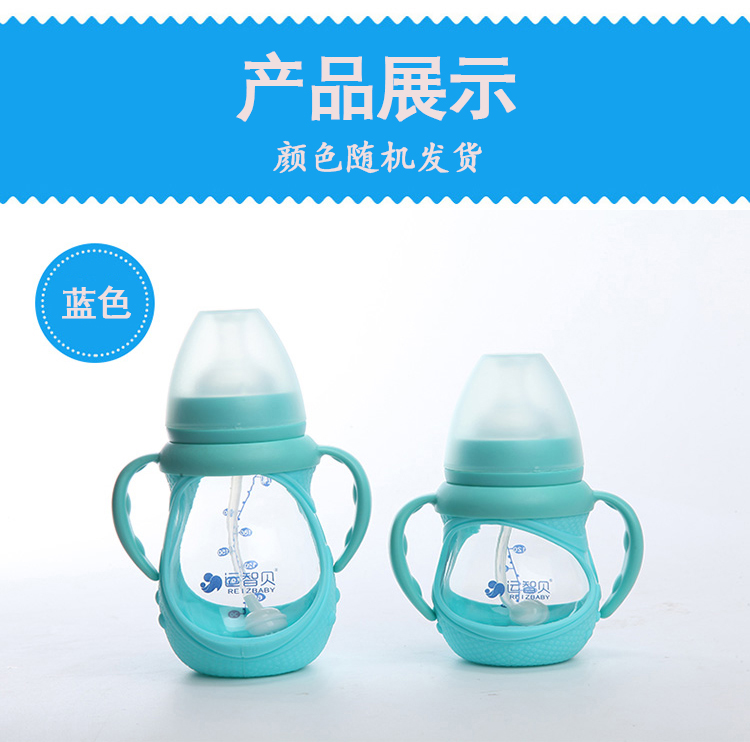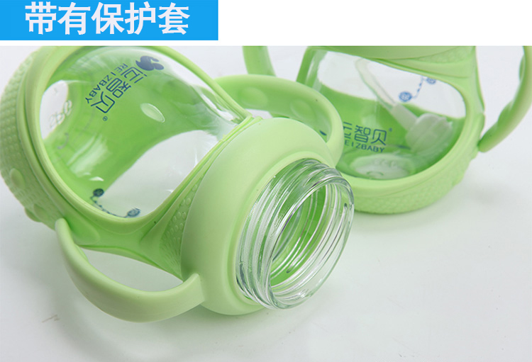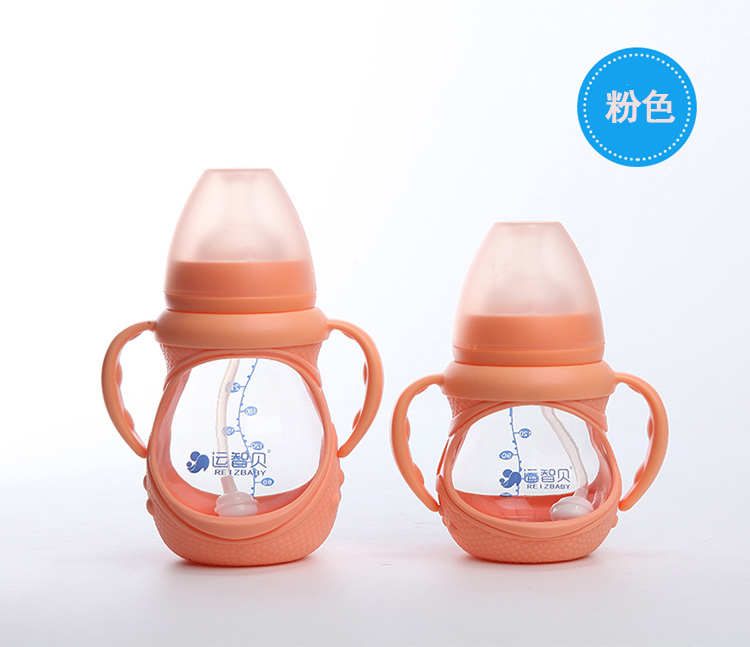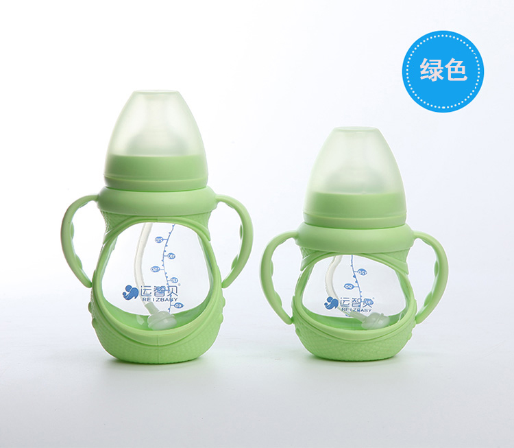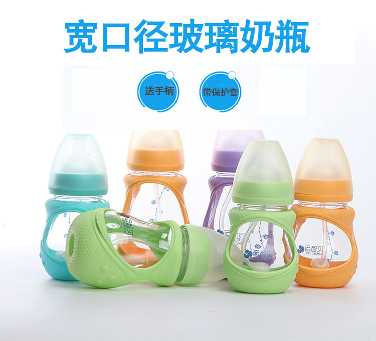 运智贝婴儿玻璃奶瓶新生儿母婴宝宝用品宽口径防摔奶瓶带手柄吸管保护套 150ml(颜色随机发货)