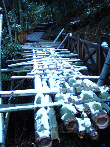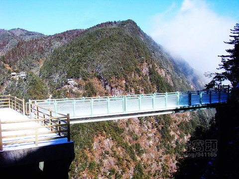 海拔1616米高的乌云崖上,有一条供游客旅游观光的栈道——青云栈道。栈道起于梦月山庄,穿过长150米的星月洞,全长1650米,悬空在乌云崖峭壁上。当初建设者们在绝壁上凿洞,搭钢管支架,铺木板,再铺设钢筋,最后铺上水泥,这个工程可不简单啊,特别有一段用玻璃制成的悬空小桥,真要有点胆量才敢走过去。还好,桥面都是积雪,俺才敢走过去啊:)