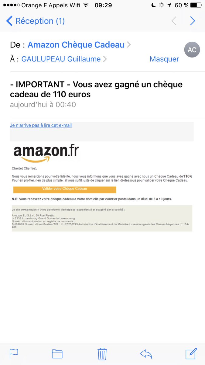 亚马逊法国用户GuillaumeGaulup今日在推特上发帖并艾特亚马逊官方账号称,其于今天收到了一封邮件,被告知获得了价值110欧元的礼品卡,并可通过点击邮件中提供的链接来激活。