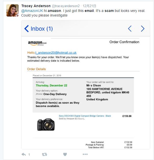 正值圣诞节消费旺季,盯着消费者钱包的不只是正在大肆搞促销的商家,还有一批网络诈骗分子。最近一段时间,大量亚马逊用户在facebook、twitter等社交平台上发帖称,自己曾遭遇虚假亚马逊邮件诈骗,并且已有不少网友因此泄漏了个人重要信息。